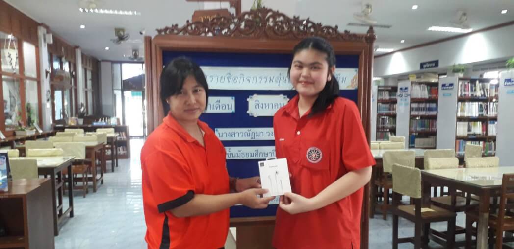 มอบ slip ให้กับนักเรียนบันทึกเกี่ยวกับหนังสือที่ยืม คนละ 1 แผ่น /1 เล่ม และนำไปหย่อนลงกล่อง และจับรางวัลผู้โชคดีทุกสิ้นเดือน เดือนละ 1 ครั้ง